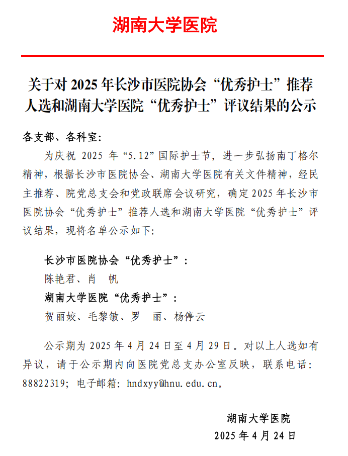 关于对 2025 年长沙市医院协会“优秀护士”推荐 人选和湖南大学医院“优秀护士”评议结果的公示
