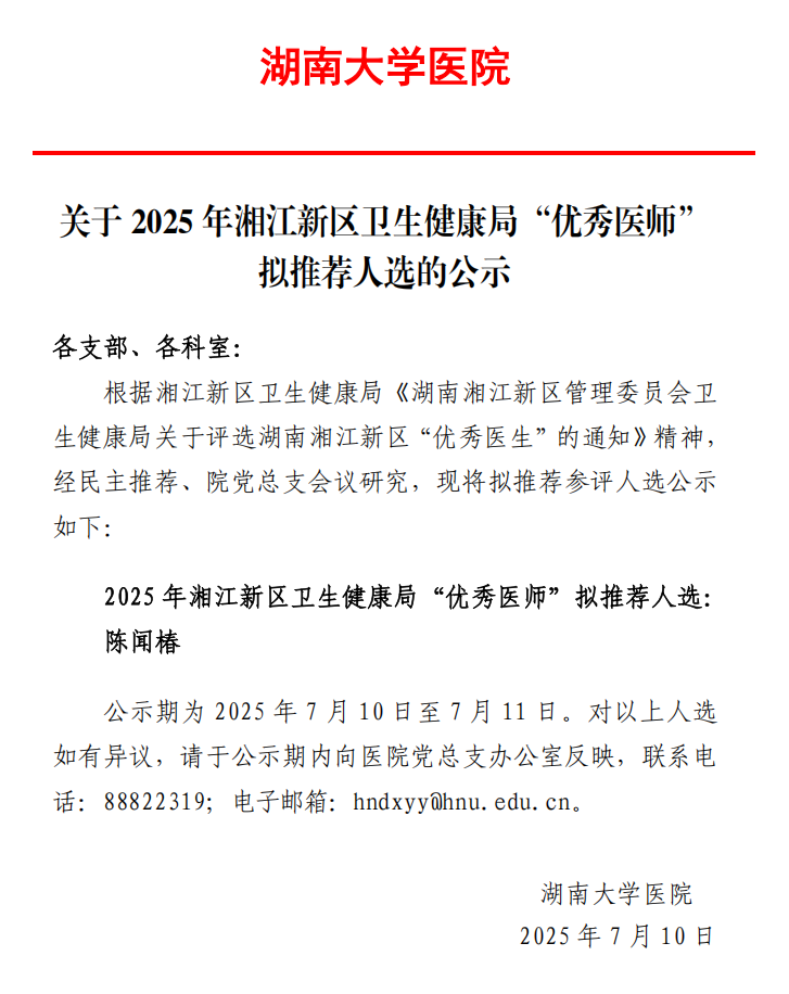 关于 2025 年湘江新区卫生健康局“优秀医师” 拟推荐人选的公示