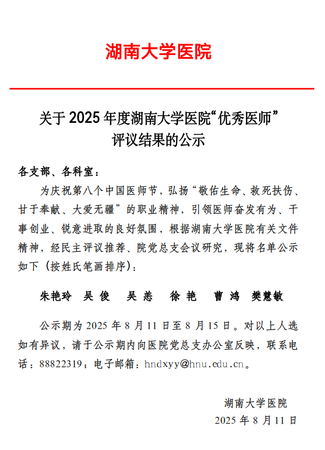关于2025年度湖南大学医院优秀医师评议结果的公示